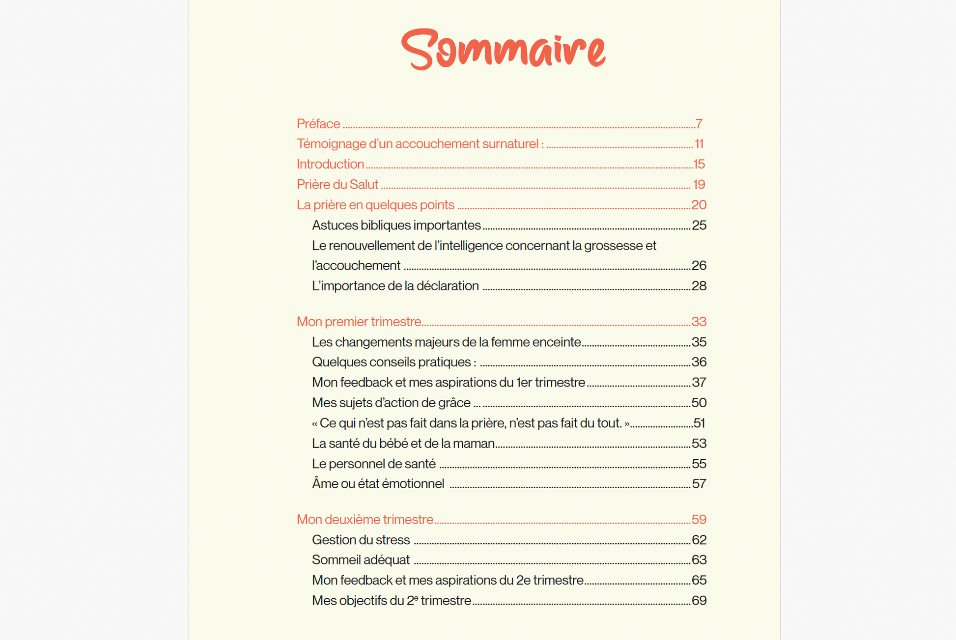 "Un livre complet qui aide dans le parcours de la grossesse ainsi que sur la parole de Dieu. Ce livre aide, rassure, et accompagne. Encore merci pour ce livre"