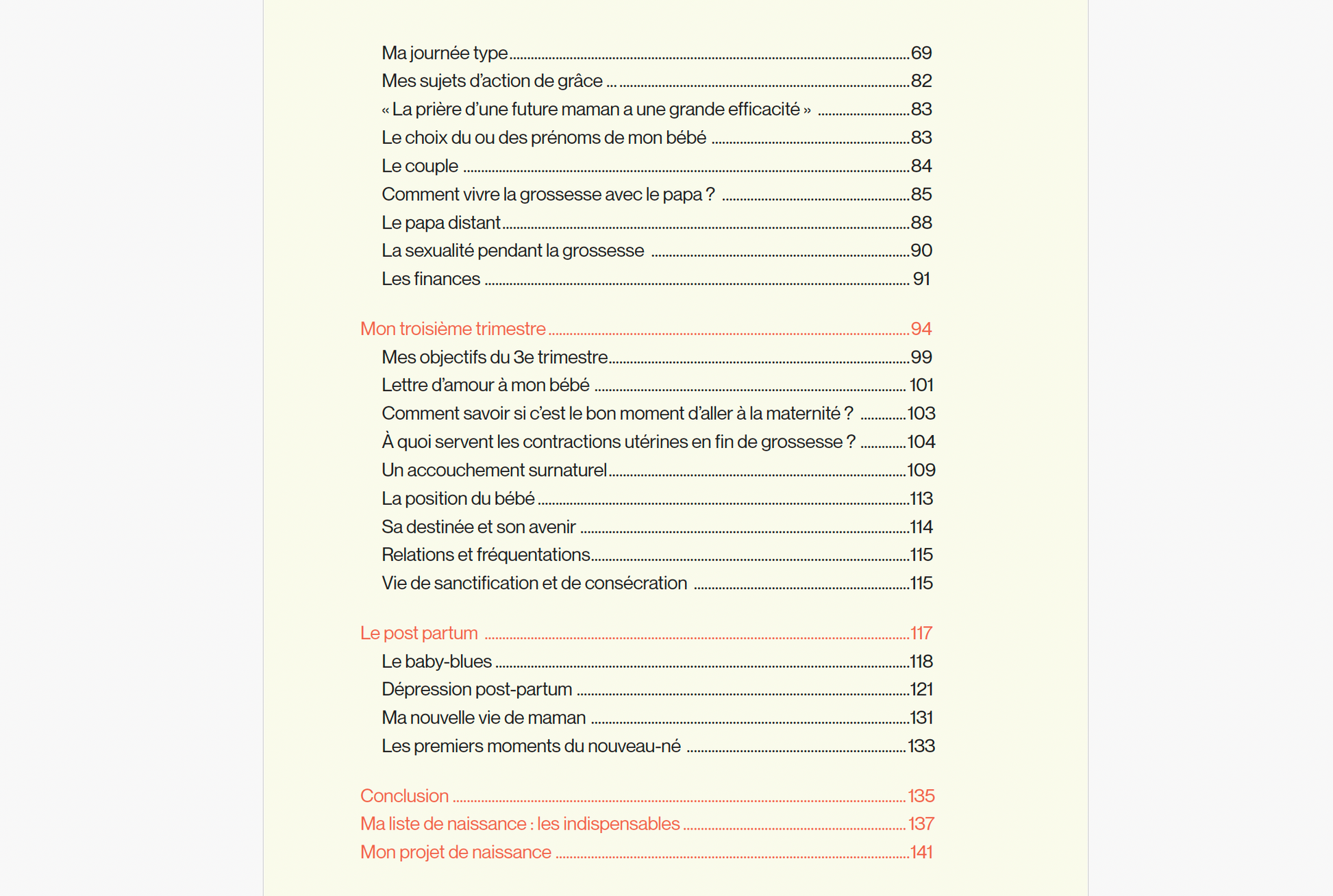 "Un indispensable comme accompagnement un parcours de grossesse focus sur la parole de Dieu. En plus j' aime bien les couleurs choisies pour chaque thème, ça change des livres en noir et blanc."